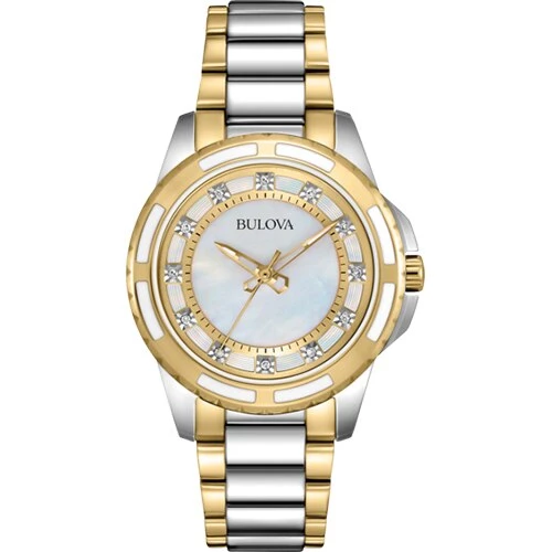 This Womens Bulova two-tone bracelet watch brings a sense of style to your jewelry collection. Its design showcases a stunning mother of pearl dial with 12 hand set diamond accents, a Swiss quartz movement and a fold-over buckle closure. To clean wipe with a soft dry cloth. Case Dimensions: 36mm x 7mm.Style 98P140.Limited Manufacturer’s Warranty.