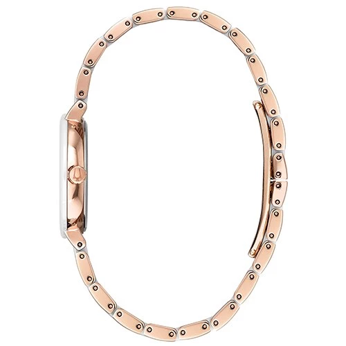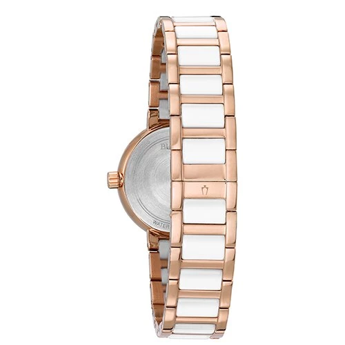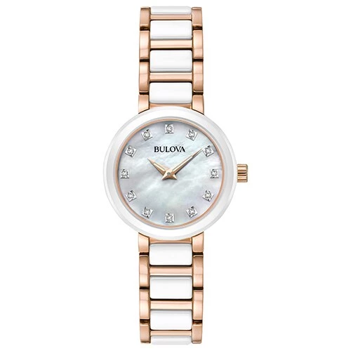 The Womens Bulova Diamonds Collection watch showcases a stunning rose gold-tone stainless steel design with 12 diamonds that are individually hand set on the white Mother of Pearl dial. It features domed mineral glass, is water resistance up to 30 meters, and uses a simple deployment for closure. Case Dimensions: 28mm.Style 98P160.Limited Manufacturer’s Warranty.