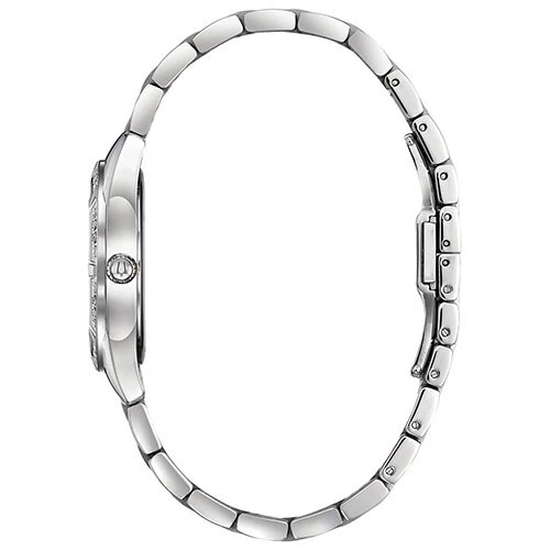 This Womens Bulova watch showcases a slim stainless steel bracelet with a push button deployant clasp. It features 16 diamonds, a lustrous white Mother of Pearl three hand dial with 3 diamonds, and a domed sapphire crystal. This watch is from the Quartz movement and is water resistance to 30 meters. Case Dimensions: 32.5mm.Style 96R228.Limited Manufacturer’s Warranty.