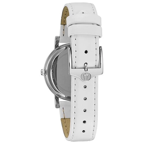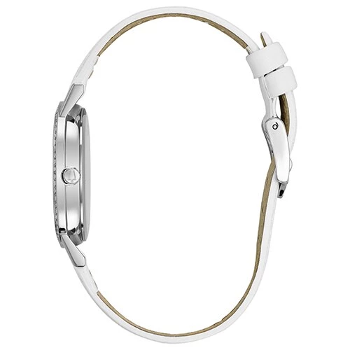 This Womens Bulova Crystal Collection watch is in stainless steel and embellished with 68 crystals on the bezel and white Mother of Pearl dial. Other features include: a sweep seconds sub-dial and a chic white leather strap with a simple 3-piece buckle closure. Water resistant to 30 meters. To clean wipe with a soft dry cloth. Case Dimensions: 32mm x 7mm.Style 96L245.Limited Manufacturer’s Warranty.