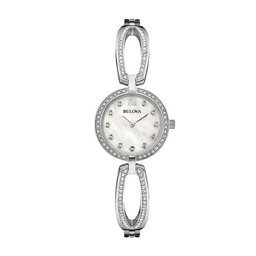 This Womens Bulova Crystal Collection watch showcases a stainless steel finish with 129 individually set crystals on the silver-tone case. It features a Mother of Pearl dial, flat mineral glass, bracelet with a jewelry clasp closure, and is water resistance to 30 meters. Watch case size: 26mm.Style 96L223.
