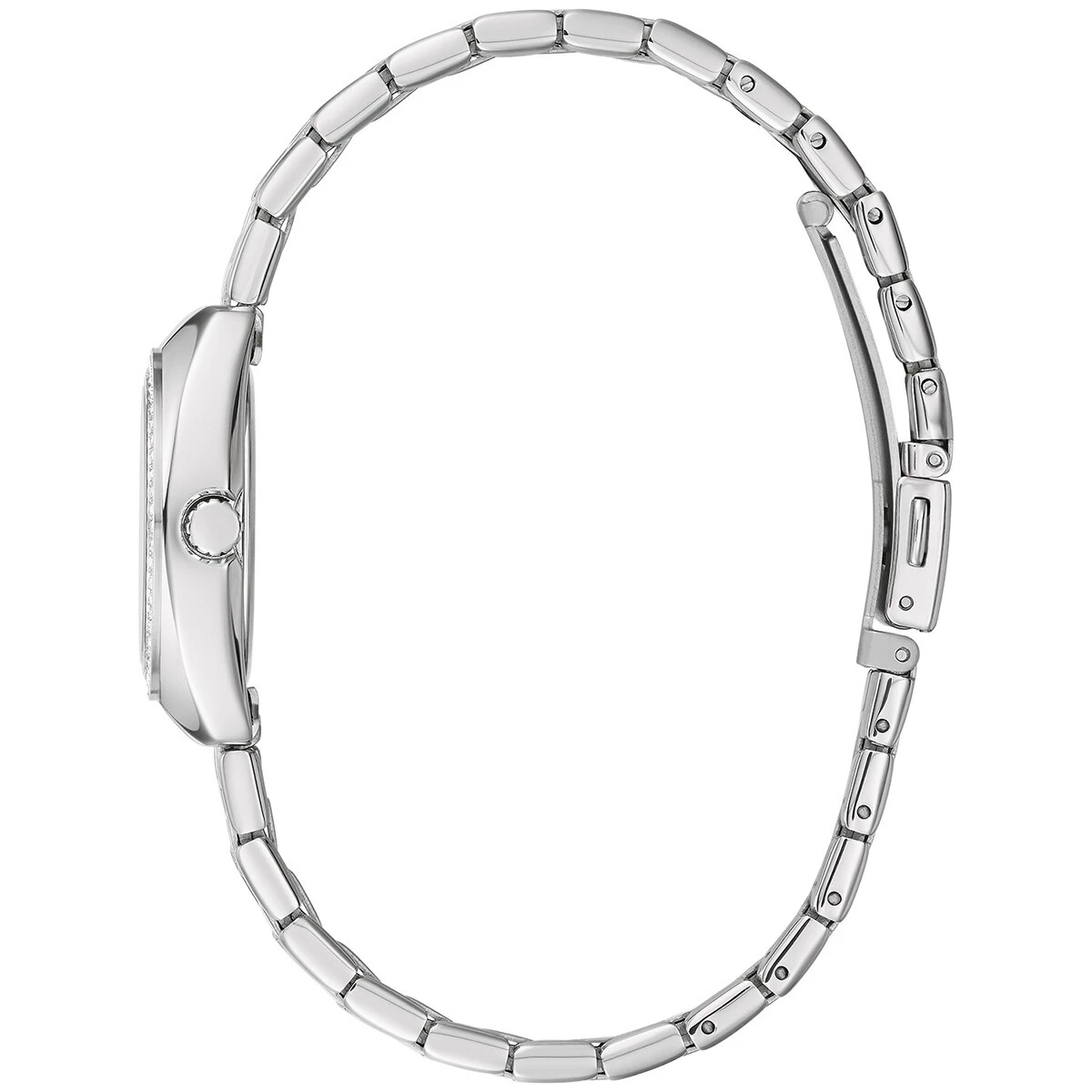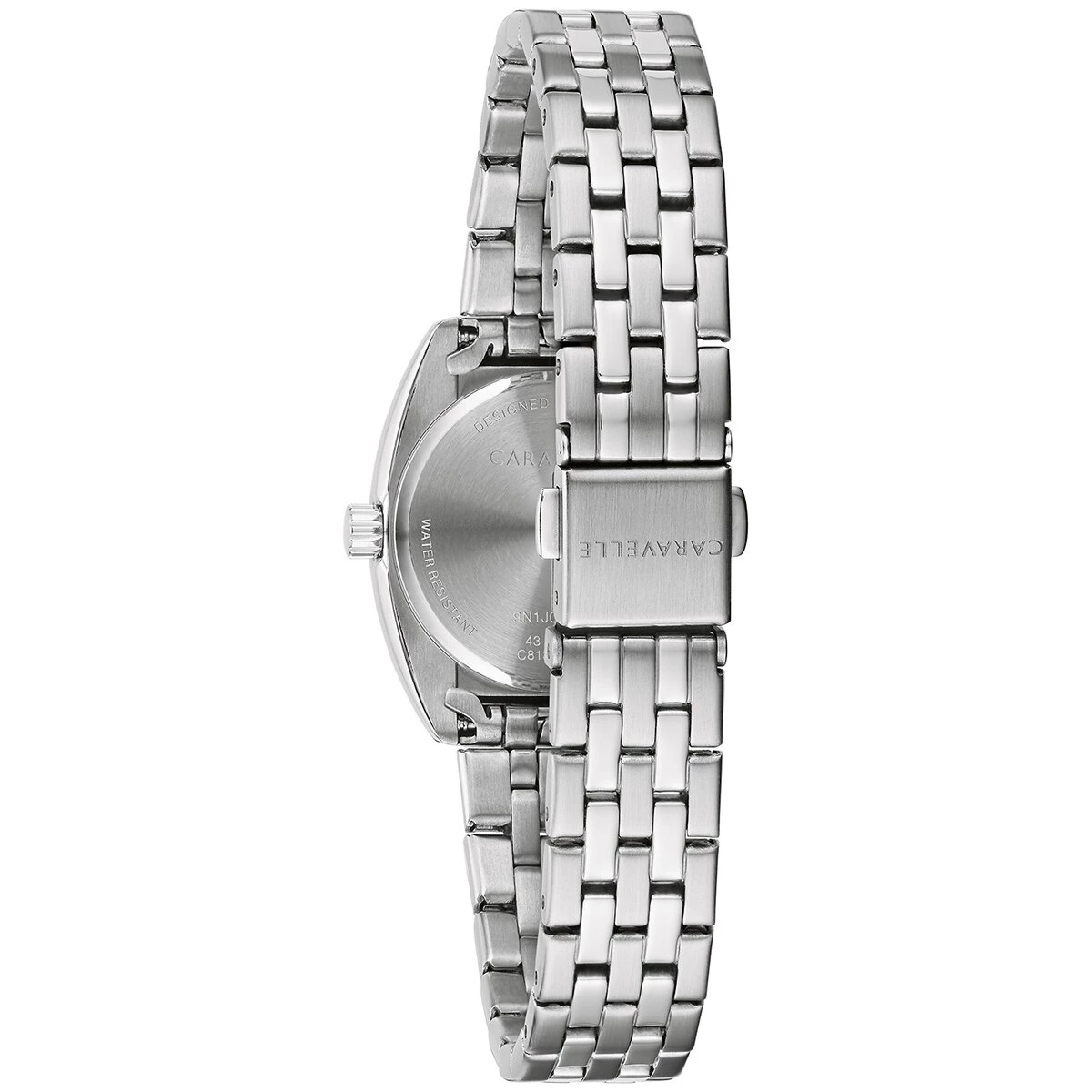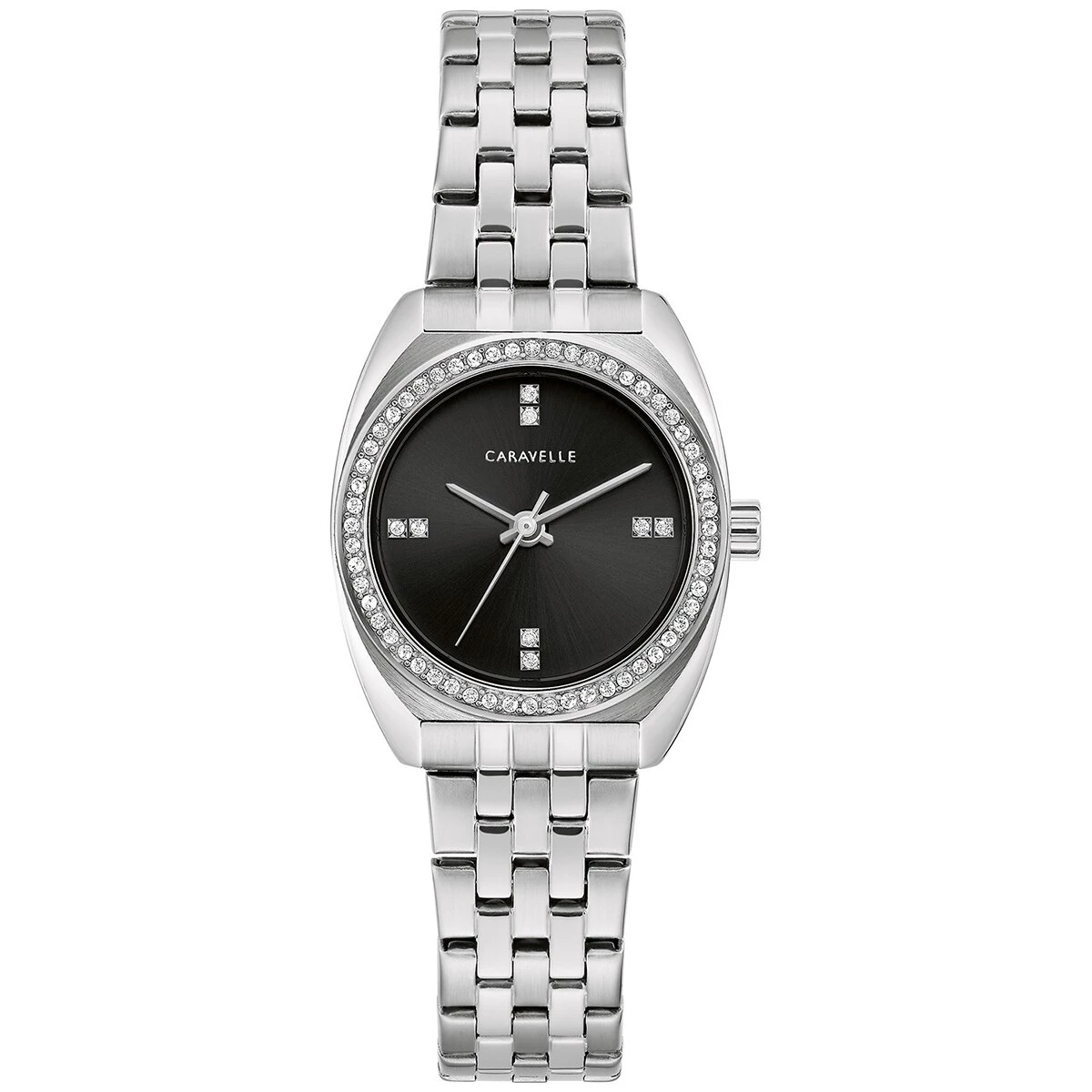 The Caravelle by Bulova stainless bracelet watch offers a sporty case with a mini look. This watch features a stainless steel case with a black dial, crystals surrounding the bezel and added sparkle on the dial, and mineral crystal lens. This watch is water-resistant up to 30 meters.